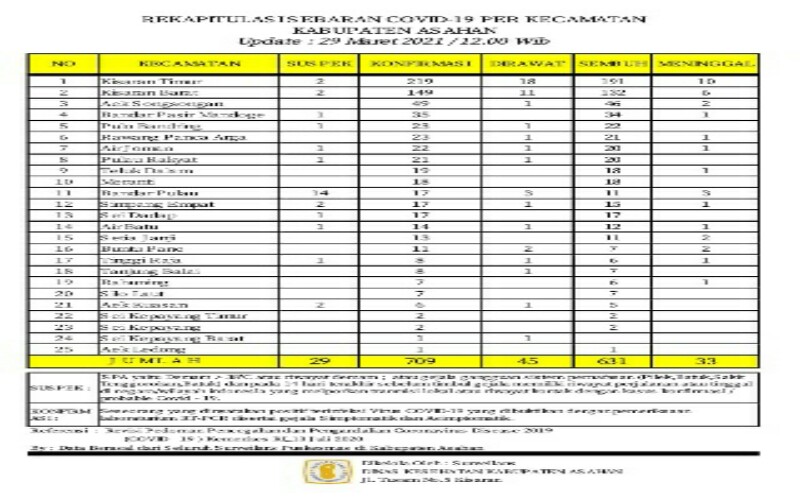 Demikian Data Update tersebut disampaikan Juru Bicara Satuan Tugas Percepatan Penanganan Covid – 19 Kabupaten Asahan H. Rahmat Hidayat Siregar S. Sos. M.Si,berdasarkan hasil data surveilans dari seluruh Puskesmas yang ada di wilayah Kabupaten Asahan sebagaimana di kelola Dinas Kesehatan Kabupaten Asahan. Senin (29/03/2021) .