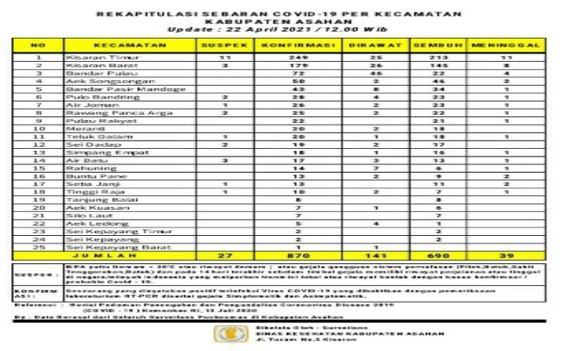 Demikian Data Update tersebut disampaikan Juru Bicara Satuan Tugas Percepatan Penanganan Covid – 19 Kabupaten Asahan H. Rahmat Hidayat Siregar S. Sos. M.Si berdasarkan hasil data surveilans dari seluruh Puskesmas yang ada di wilayah Kabupaten Asahan sebagaimana di kelola Dinas Kesehatan Kabupaten Asahan Kamis (22/04/2021).