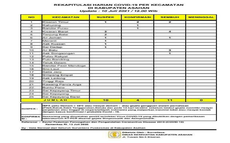 Tetap berdasarkan hasil Rekapitulasi Harian Covid-19 per Kecamatan untuk hari ini sebagaimana data surveilans dari seluruh Puskesmas yang ada di wilayah Kabupaten Asahan yang di kelola Dinas Kesehatan Kabupaten Asahan.