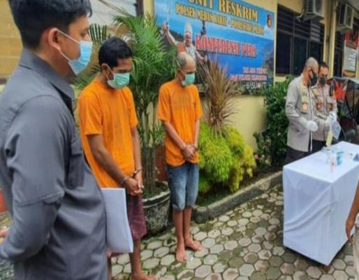 Diamankan 2 dari 4 orang tersangka beserta barang bukti berupa gergaji besi, 1 unit Beca bermotor (Betor) warna hitam tanpa plat polisi dan 2 batang potongan besi pagar warna putih, Jumat (1/5/2020)