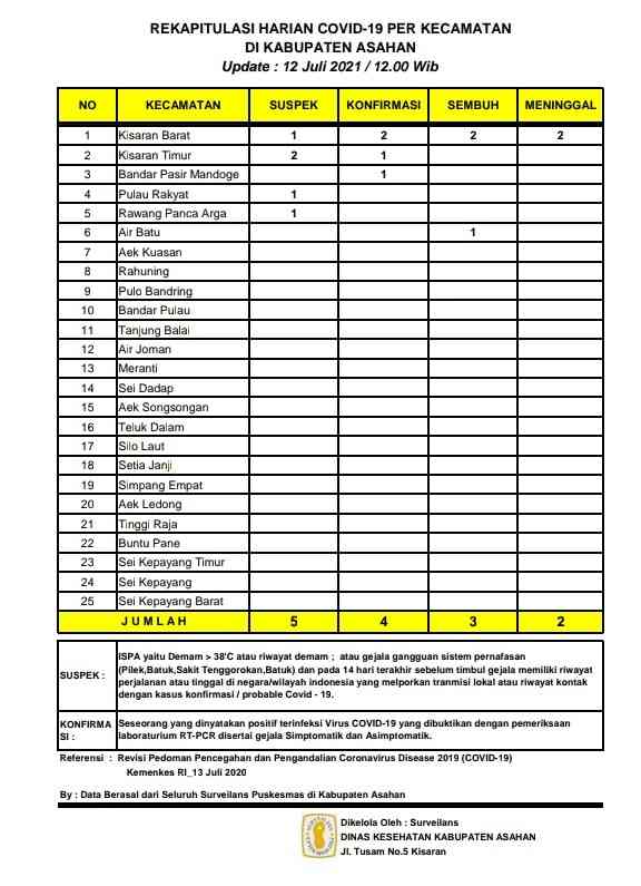 Rahmat Hidayat mengatakan, berdasarkan rekapitulasi harian Covid-19 per Kecamatan di Kabupaten Asahan, di update pada hari ini, Pukul 12:00 Wib. Sesuai data survailans di seluruh Puskesmas yang ada di wilayah Kabupaten Asahan, yang dikelola Dinas Kesehatan Kabupaten Asahan tanggal 12 Juli 2021, dua orang warga Asahan Kecamatan Kota Kisaran Barat meninggal dunia terinveksi Covid-19.