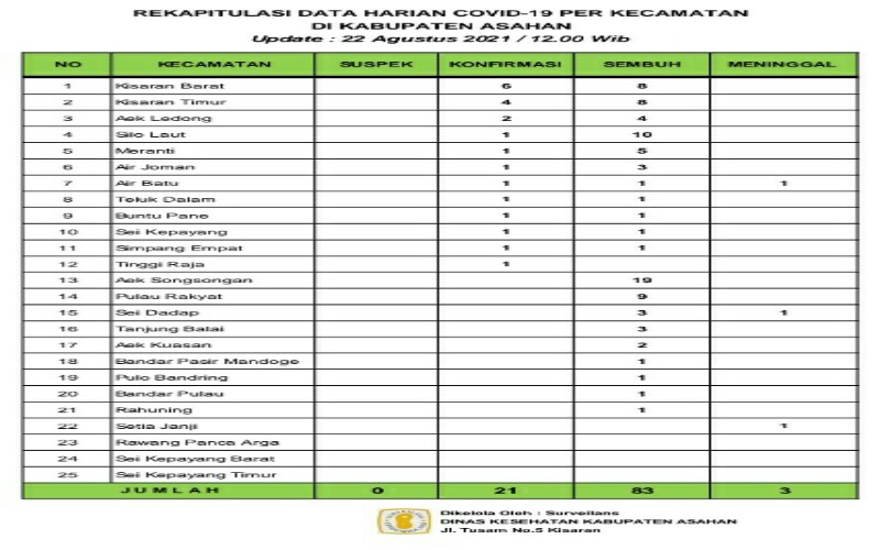 tobapos – Rekapitulasi Harian Covid – 19 per Kecamatan untuk hari ini sebagaimana data surveilans dari seluruh Puskesmas yang ada di wilayah Kabupaten Asahan yang di kelola Dinas Kesehatan Kabupaten Asahan yang Konfirmas sebanyak 21 orang, 83 orang Sembuh dan 3 Meninggal dunia akibat Covid – 19.