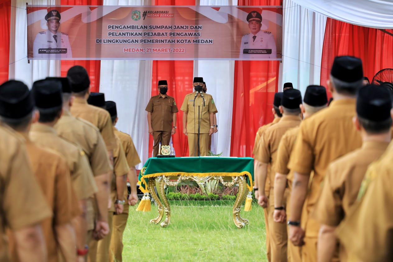 tobapos.co – Wali Kota Medan Bobby Nasution diwakili Sekda Wiriya Alrahman melantik dan mengambil Sumpah Janji 221 Pejabat Pengawas di Lingkungan Pemko Medan, Senin (21/3/2022) di Stadion Kebun Bunga. Diharapkan para pejabat yang dilantik ini dapat bekerja dengan rasa penuh tanggung jawab sesuai dengan ketentuan dan peraturan yang berlaku.