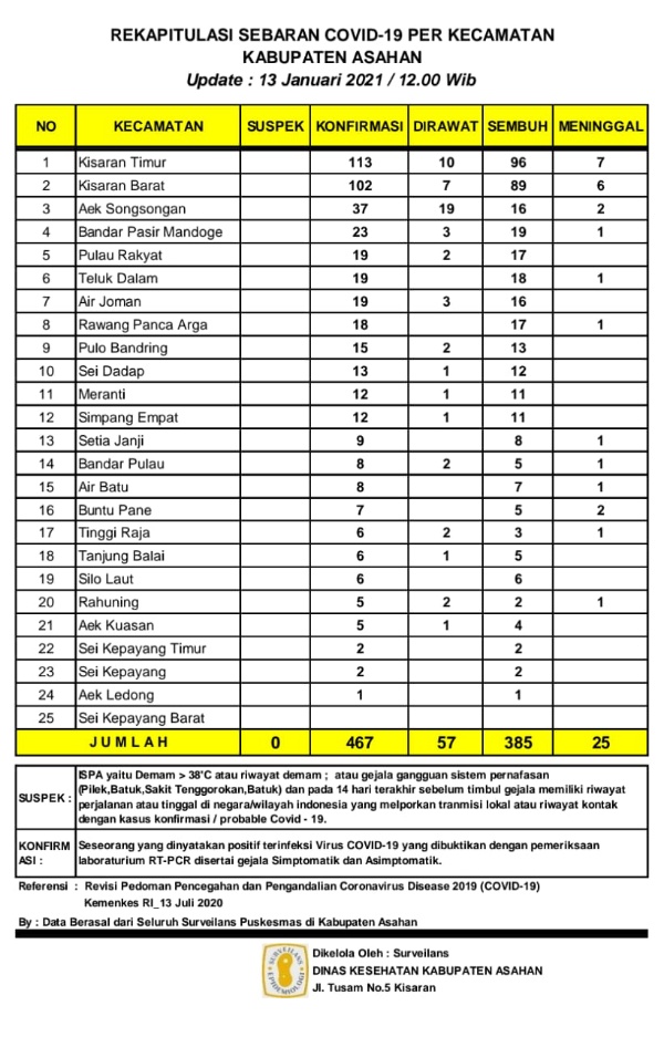 Demikian Data Update tersebut disampaikan Juru Bicara Satuan Tugas Percepatan Penanganan Covid – 19 Kabupaten Asahan H. Rahmat Hidayat Siregar S. Sos. M.Si,berdasarkan hasil data surveilans dari seluruh Puskesmas yang ada di wilayah Kabupaten Asahan sebagaimana di kelola Dinas Kesehatan Kabupaten Asahan Rabu, (13/01/2021).