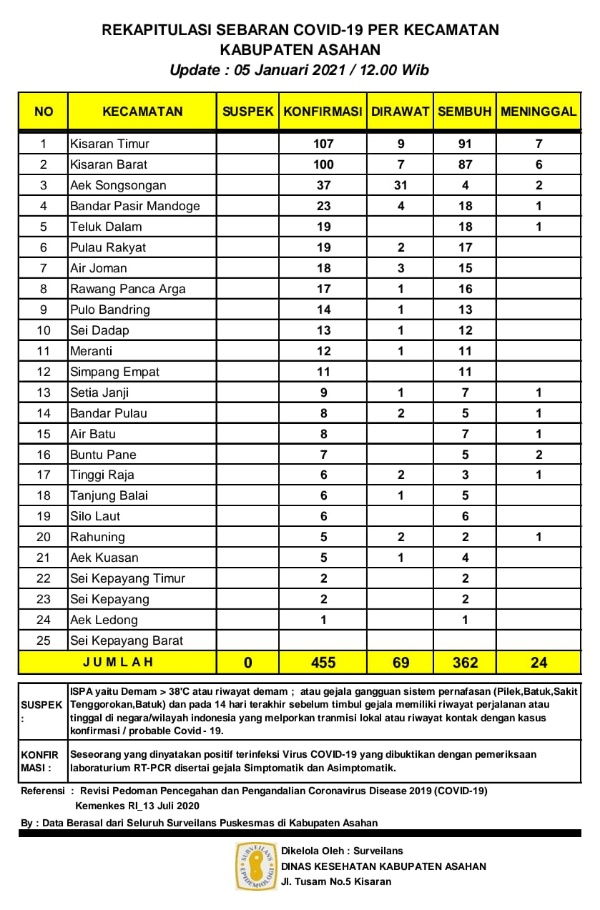 Demikian Data Update tersebut disampaikan Juru Bicara Gugus Tugas Percepatan Penanganan Covid – 19 Kabupaten Asahan H. Rahmat Hidayat Siregar S. Sos. M.Si, berdasarkan hasil data surveilans dari seluruh Puskesmas yang ada di wilayah Kabupaten Asahan sebagaimana di kelola Dinas Kesehatan Kabupaten Asahan Selasa (05/01/2021).