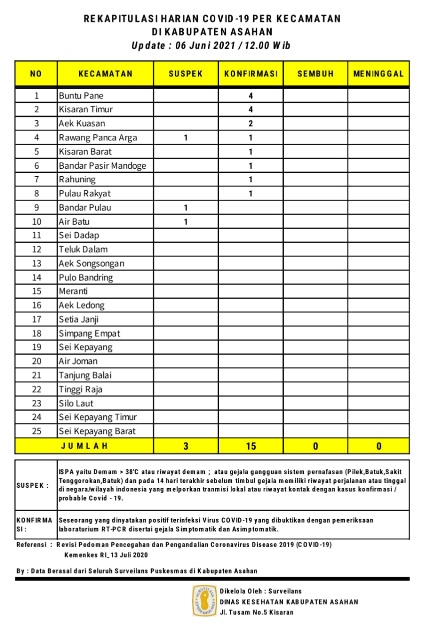 Lebih lanjut dikatakannya Dimana Data kemarin pada tanggal 05 Juni 2021 Rekapitulasi Harian Covid – 19 per Kecamatan di Asahan dengan jumlah 6 warga Asahan suspek, 8 konfirmasi dan 2 meninggal dunia akibat dari Covid.