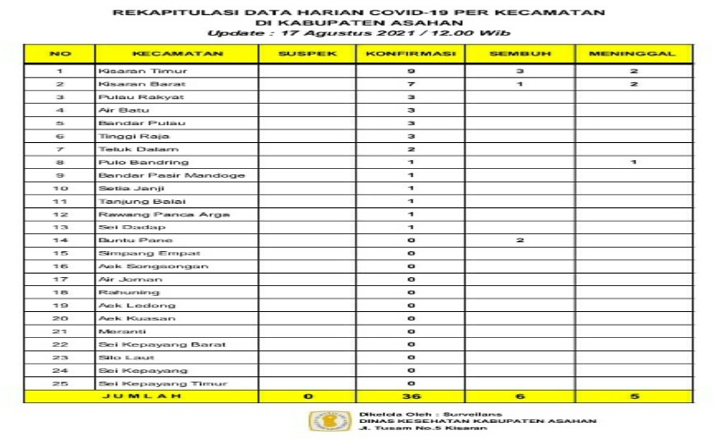 tobapos.co – Rekapitulasi Harian Covid – 19 per Kecamatan untuk hari ini sebagaimana data surveilans dari seluruh Puskesmas yang ada di wilayah Kabupaten Asahan yang di kelola Dinas Kesehatan Kabupaten Asahan yang Konfirmas sebanyak 36 orang, 6 orang Sembuh dan 5 Meninggal dunia akibat Covid – 19.