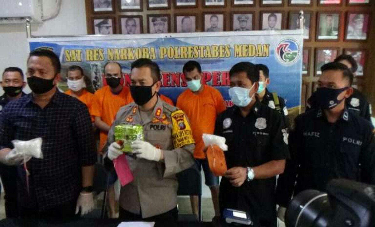 Konferensi Pers tersebut dipimpin Wakapolrestabes AKBP Irsan Sinuhaji, didampingi Wakasat Resnakoba Polrestabes Kompol Doly Nainggolan dan Kanit III Res Narkoba Polrestabes Medan Iptu Irwanta Sembiring.