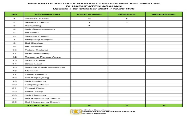 tobapos.co – Rekapitulasi Harian Covid – 19 per Kecamatan untuk hari ini sebagaimana data surveilans dari seluruh Puskesmas di wilayah Kabupaten Asahan yang di kelola Dinas Kesehatan Kabupaten Asahan 4 warga terkonfirmasi positif, 2 orang yang telah dinyatakan sembuh dan tidak yang meninggal dunia.