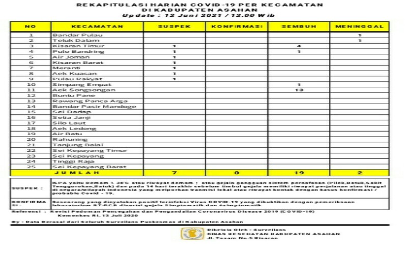 Lebih lanjut dikatakannya Dimana Data kemarin pada tanggal 11 Juni 2021 Rekapitulasi Harian Covid – 19 per Kecamatan di Asahan dengan jumlah 8 warga Asahan suspek, 30 konfirmasi dan 3 meninggal dunia akibat Covid.