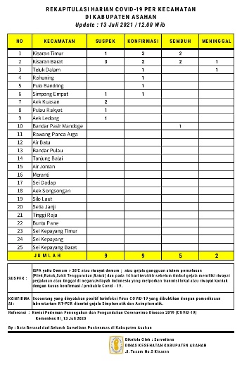 tobapos.co – Rekapitulasi Harian Covid – 19 per kecamatan untuk hari ini sebagaimana data surveilans dari seluruh Puskesmas yang ada di wilayah Kabupaten Asahan yang dikelola Dinas Kesehatan Kabupaten Asahan ada 9 warga Asahan suspek, 9 konfirmasi, 5 sembuh dan 2 meninggal dunia akibat Covid – 19.
