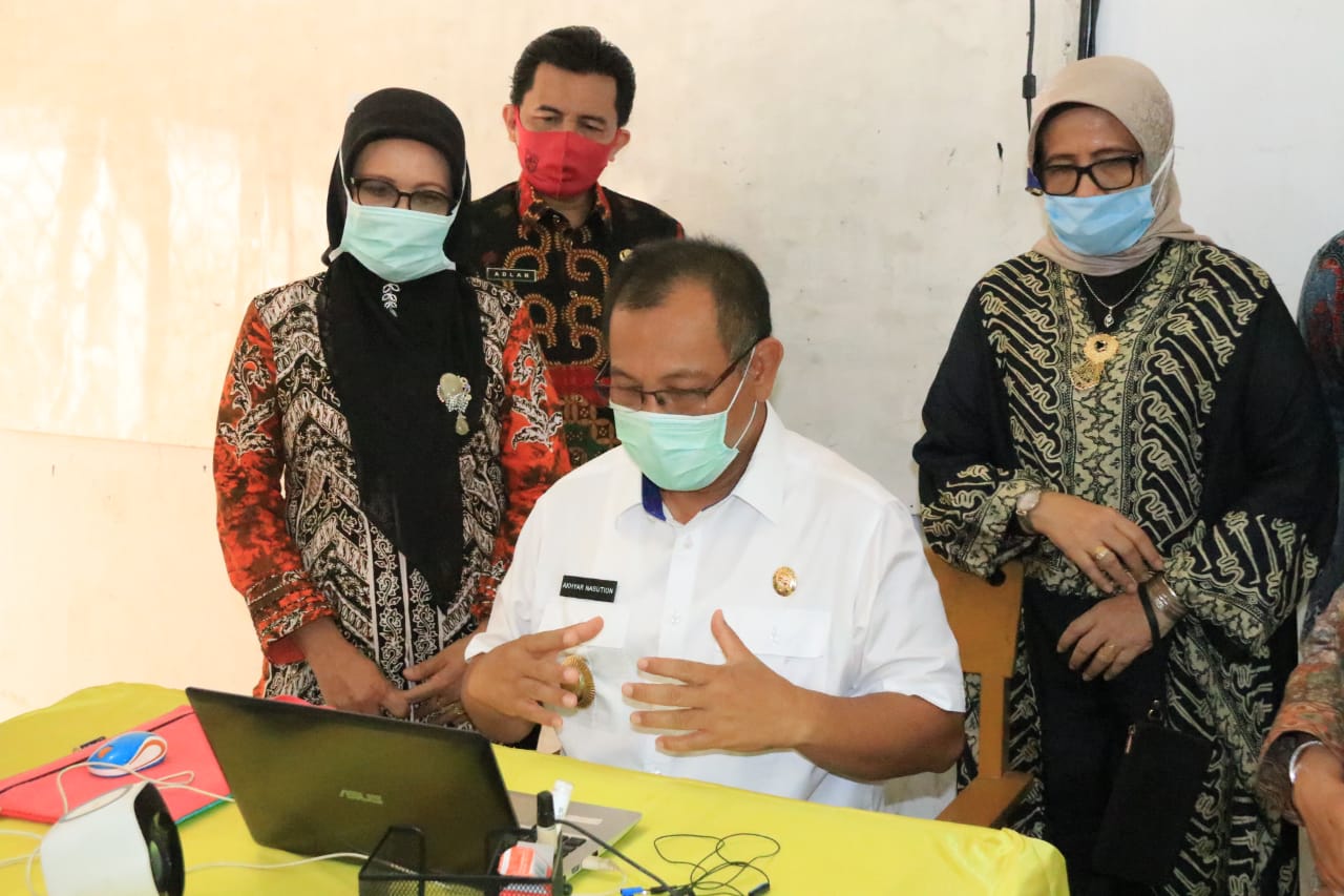 tobapos.co–Pelaksana Tugas (Plt) Wali Kota Medan Ir H Akhyar Nasution MSi menyaksikan proses belajar secara jarak jauh berbasis dalam jaringan (Daring) di SMP Negeri 2 Medan Jalan Brigjend Katamso No 51, Kampung Baru, Kecamatan Medan Maimun, Kamis (16/7). Dalam proses daring ini guru memberikan materi pelajaran menggunakan aplikasi class online kepada para murid yang berada di rumahnya masing-masing. Langkah ini dilakukan karena proses belajar tatap muka belum bisa dilakukan mengingat pandemi Corona Virus Disease 2019 (Covid-19) di Kota Medan belum berakhir.
