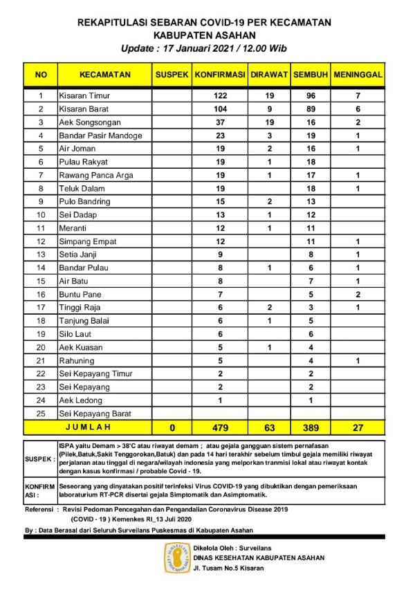 Demikian Data Update tersebut disampaikan Juru Bicara Satuan Tugas Percepatan Penanganan Covid – 19 Kabupaten Asahan H. Rahmat Hidayat Siregar S. Sos. M.Si,berdasarkan hasil data surveilans dari seluruh Puskesmas yang ada di wilayah Kabupaten Asahan sebagaimana di kelola Dinas Kesehatan Kabupaten Asahan Minggu, (17/01/2021).