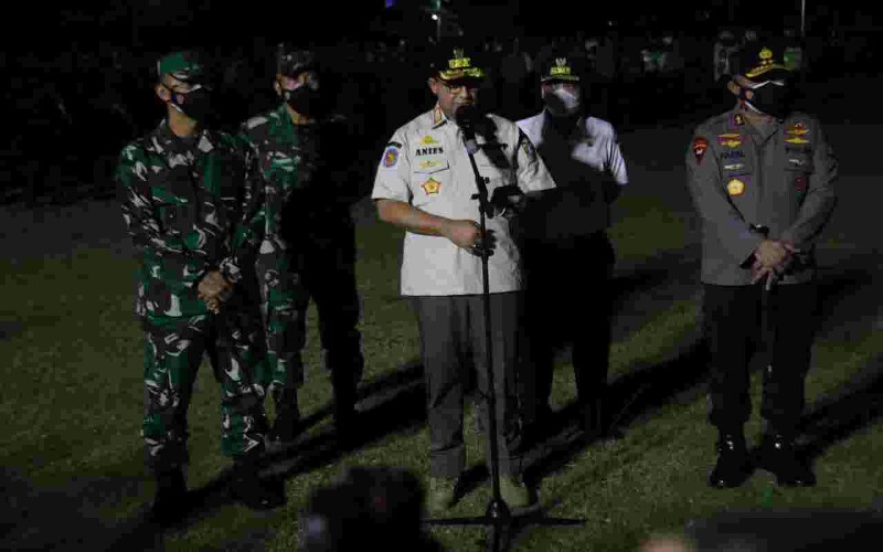 “Malam hari ini kami dari unsur Pemprov DKI, bersama Polda Metro Jaya, Pangdam Jaya, dan unsur masyarakat, berkumpul bersama-sama di sini untuk memulai babak baru dalam penanganan pandemi covid di ibu kota,” ucap Anies.