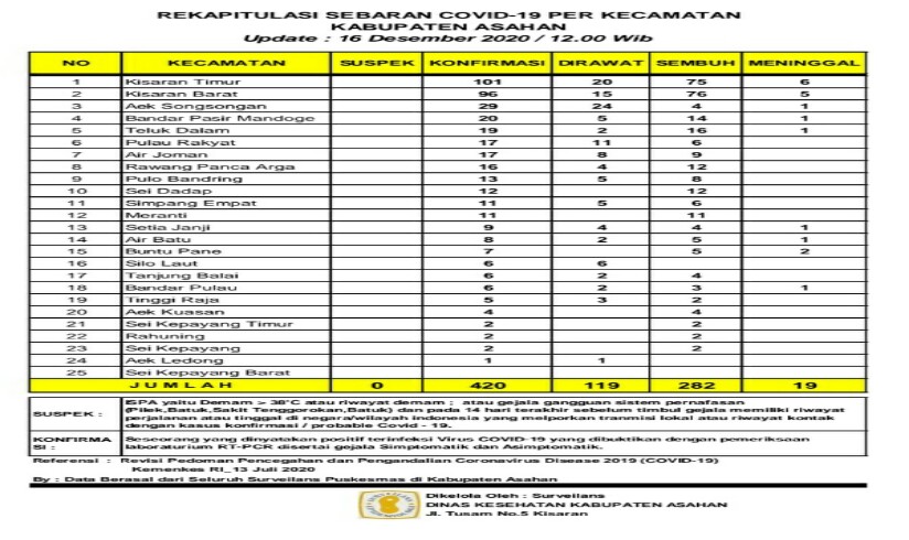 Demikian Data Update tersebut disampaikan Juru Bicara Gugus Tugas Percepatan Penanganan Covid – 19 Kabupaten Asahan H. Rahmat Hidayat Siregar S. Sos. M.Si, berdasarkan hasil data surveilans dari seluruh Puskesmas yang ada di wilayah Kabupaten Asahan sebagaimana di kelola Dinas Kesehatan Kabupaten Asahan Rabu (16/12/2020) sekira pukul 12.00 Wib,