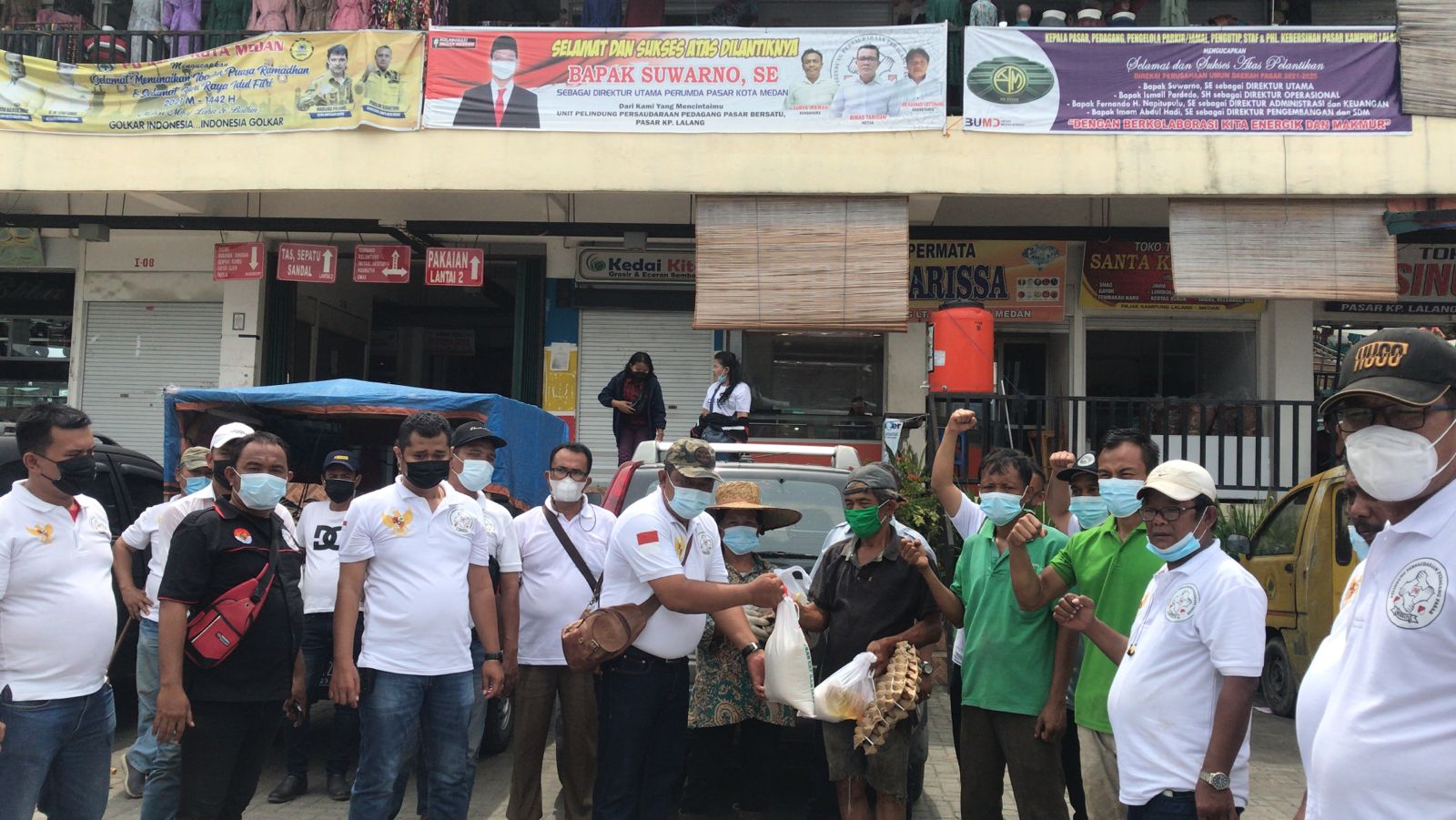 tobapos.co – DPD Pelindung Persaudaraan Pedagang Pasar Bersatu (P4B) Kota Medan bertekad membersihkan seluruh pasar tradisional di Medan. Tekad itu disampaikan Ketua DPD P4B Medan, Siswarno dan Bendahara Umum DPP P4B Mester Harahap saat memimpin gotong royong membersihkan Pasar Kampung Lalang, bagi sembako ke petugas kebersihan dan pembagian masker gratis bersama PUD Pasar Kampung Lalang, Selasa (5/10/2021).