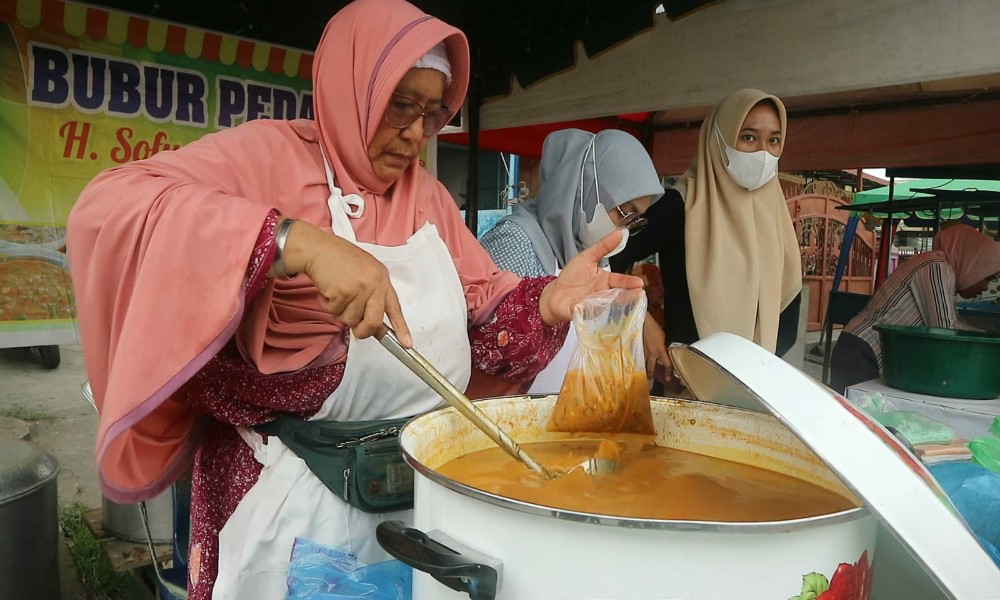 Aroma rempah dari bubur podas membuat pedagang tidak pernah sepi pembeli. Ratusan porsi ludes terjual setiap hari di pusat jajanan takjil, di Jalan Listrik, Kota Tanjungbalai.