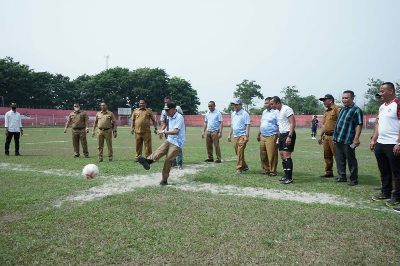 Bupati Asahan melakukan penendangan bola pertama menandakan Seleksi GSI Tingkat Kabupaten Asahan Tahun 2022 telah resmi dibuka.(do)