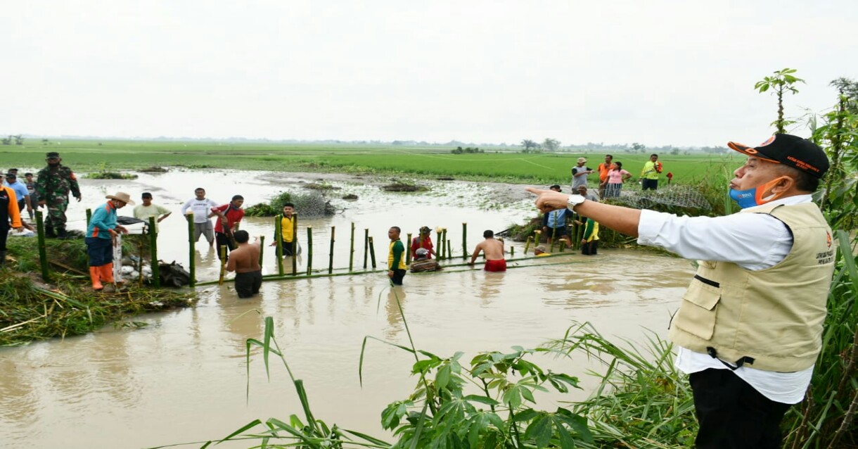 Bupati Sergai Ir H Soekirman yang juga Ketua Gugus Tugas Percepatan Penanganan Corona Virus Disease (Covid-19) meninjau daerah Irigasi Sei Belutu yang mengalami tanggul jebol lebih kurang sepanjang 10 meter akibat curah hujan yang tinggi.