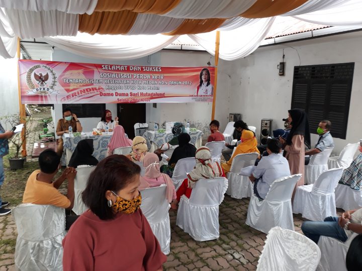 tobapos.co–Pelaksanaan Sosialisasi Perda ke -IV Nomor 4 Tahun 2012 Tentang Sistem Kesehatan Kota Medan yang dilaksanakan oleh anggota Dewan Perwakilan Rakyat Daerah (DPRD) Kota Medan, Dame Duma Sari Hutagalung, SE dilakukan dengan 4 (Empat) sesi namun tetap mengikuti aturan protokoler kesehatan. Dari 200 peserta, tim Dame Duma S Hutagalung, dibagi per sesinya sebanyak 50 orang yang hadir dengan kursi yang sudah dipersiapkan masing-masing berjarak satu (1)meter.