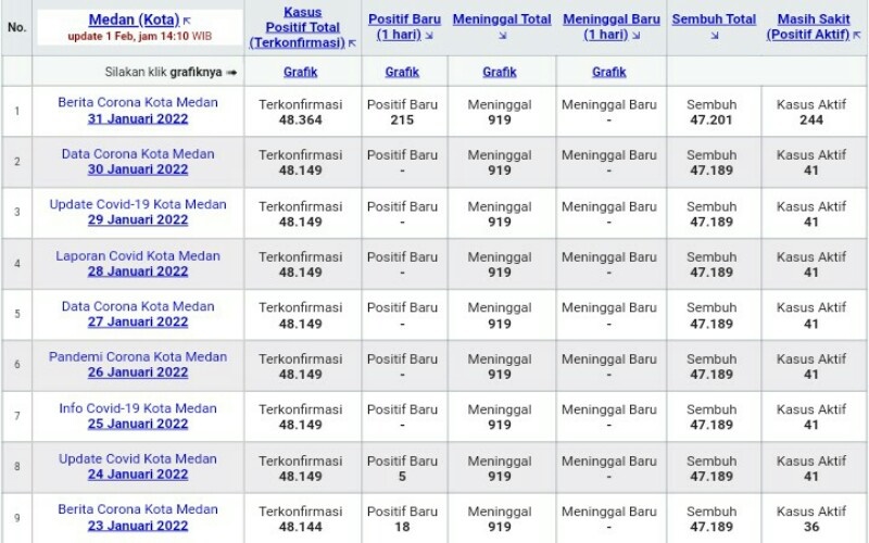 Data dari (https://www.andrafarm.com) yang mengambil dari kemkes.go.id[1], covid19.go.id[2], BNPB[3], hingga Selasa (1/2/2022) pukul 12:36:56, jumlah yang terinfeksi virus corona di Kota Medan telah mencapai 48.472. Selanjutnya yang meninggal karena COVID-19 sebanyak 919 orang, dan 346 masih dirawat (positif aktif), serta 47.207 orang dinyatakan sembuh.