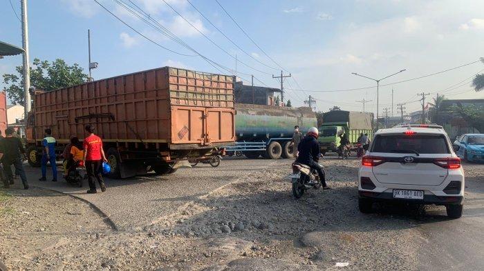 Jalan yang rusak ini juga sering dilintasi truk dan mobil kontainer. Sehingga pengendara yang melintas harus berhati-hati.