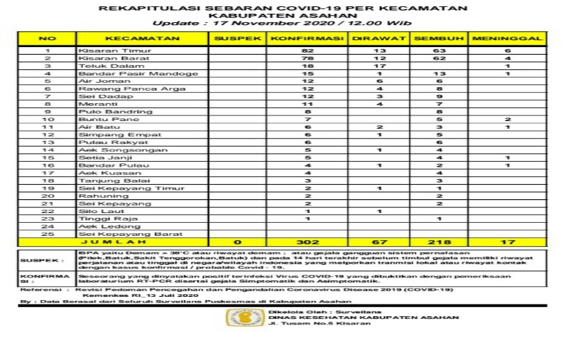 Sebagaimana data Update dari jubir gugus tugas Covid -19 Asahan sebanyak 302 warga kini terinfeksi 67 warga dalam perawatan, 218 warga dinyatakan sembuh dan 17 warga meninggal.