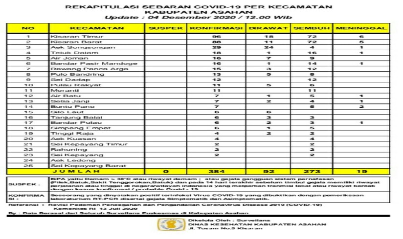 Demikian Data Update tersebut disampaikan Juru Bicara Gugus Tugas Percepatan Penanganan Covid – 19 Kabupaten Asahan H. Rahmat Hidayat Siregar S. Sos. M.Si, berdasarkan hasil data surveilans dari seluruh Puskesmas yang ada di wilayah Kabupaten Asahan sebagaimana di kelola Dinas Kesehatan Kabupaten Asahan Jum’at (04/12/2020).