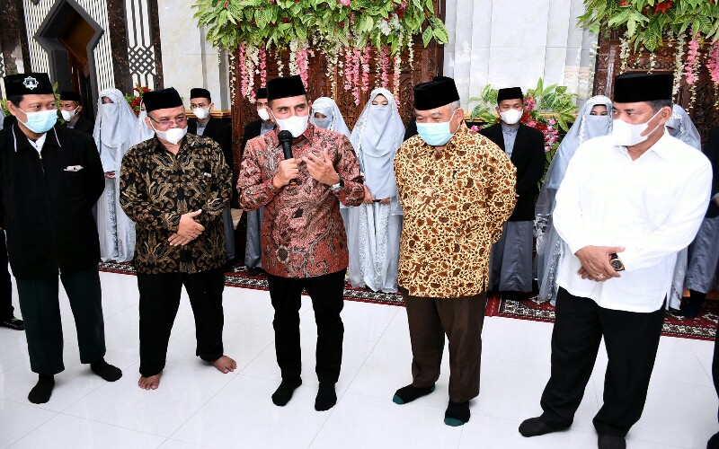Nikah massal syar’i yang diselenggarakan Pondok Pesantren (Ponpes) Hidayatullah Tanjungmorawa di Desa Bandarlabuhan, Kecamatan Tanjung Morawa, Kabupaten Deliserdang, tersebut diikuti 11 pasangan pengantin. “Semua pakai masker, pakaiannya juga sama semua, saya takut nanti malah ada yang tertukar pasangan,” kata Edy Rahmayadi sambil tertawa kecil.