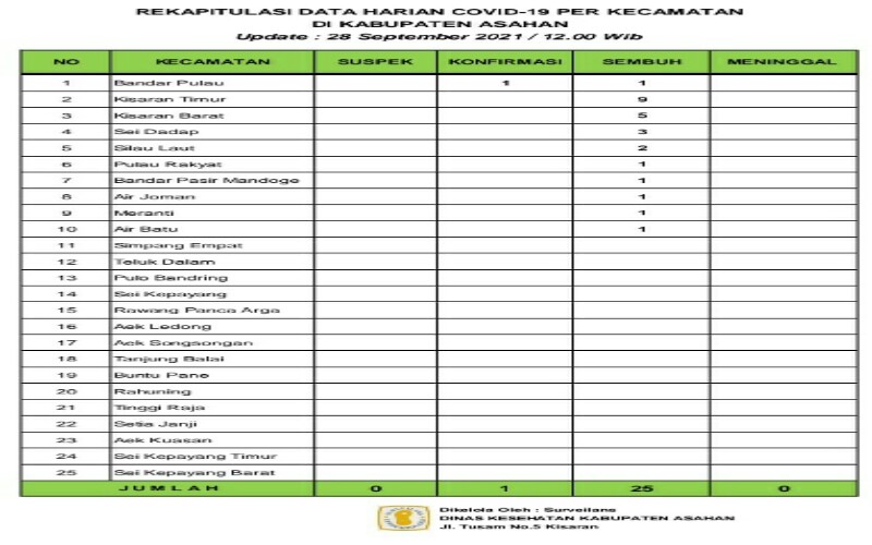 Dayat juga menyampaikan dimana data sebelumnya pada tanggal 27 September 2021 Rekapitulasi Harian Covid – 19 per Kecamatan di Asahan sebanyak 6 warga Asahan yang Terkonfirmasi Positif, 20 orang Sembuh dan tidak ada yang meninggal dunia akibat Covid-19.
