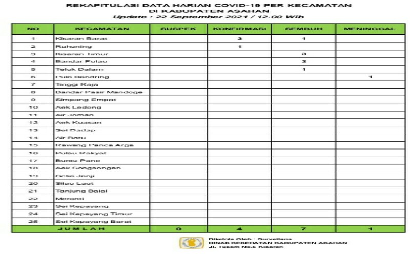 Dayat juga menyampaikan dimana data sebelumnya pada tanggal 21 September 2021 Rekapitulasi Harian Covid – 19 per Kecamatan di Asahan dengan jumlah warga Asahan yang Konfirmas sebanyak 4 orang, 12 Sembuh dan tidak ada yang meninggal dunia akibat Covid-19.