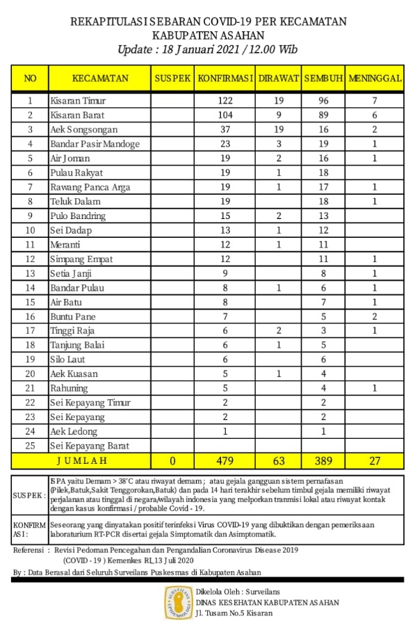 Demikian Data Update tersebut disampaikan Juru Bicara Satuan Tugas Percepatan Penanganan Covid – 19 Kabupaten Asahan H. Rahmat Hidayat Siregar S. Sos. M.Si,berdasarkan hasil data surveilans dari seluruh Puskesmas yang ada di wilayah Kabupaten Asahan sebagaimana di kelola Dinas Kesehatan Kabupaten Asahan Senin, (18/01/2021).