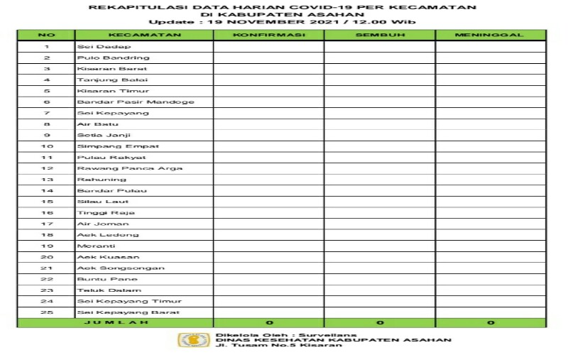 Dayat juga menyampaikan dimana data sebelumnya pada tanggal 18 Nopember 2021 Rekapitulasi Harian Covid – 19 per Kecamatan di Asahan Tidak ada warga Asahan yang dinyatakan Sembuh dari Covid – 19, tidak ada yang Terkonfirmasi Positif dan tidak ada yang meninggal dunia.