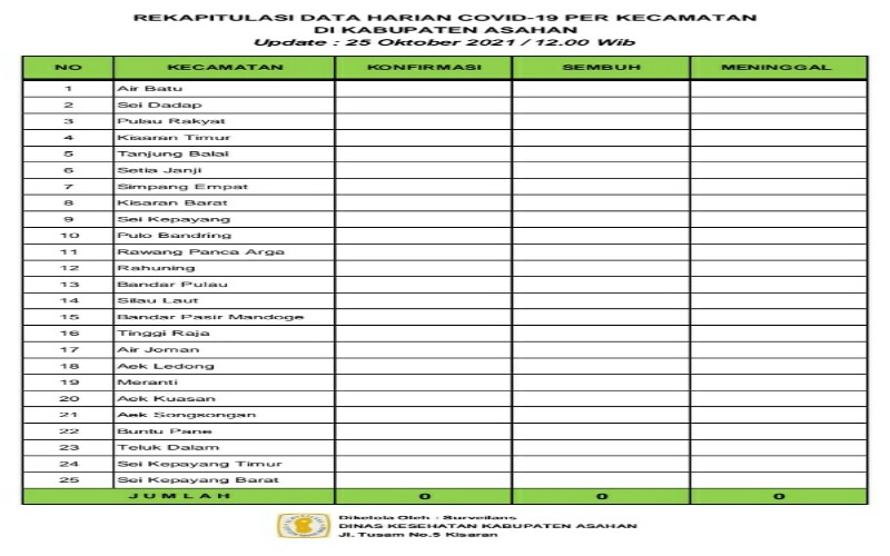 Dayat juga menyampaikan dimana data sebelumnya pada tanggal 24 Oktober 2021 Rekapitulasi Harian Covid – 19 per Kecamatan di Asahan Tidak ada warga di Asahan Terkonfirmasi Positif, 2 warga yang dinyatakan sembuh dan tidak ada yang meninggal dunia.