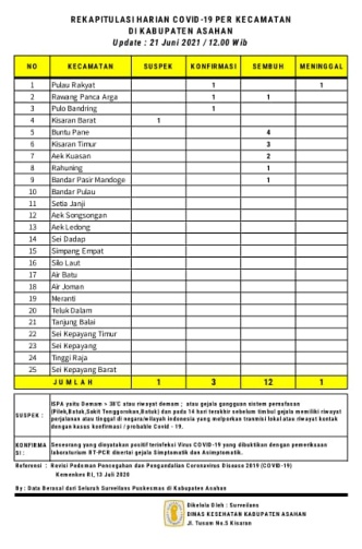 Lebih lanjut dikatakannya dimana data sebelumnya pada tanggal 20 Juni 2021 Rekapitulasi Harian Covid – 19 per Kecamatan di Asahan dengan jumlah 6 warga Asahan suspek, 4 Konfirmasi dan 6 sembuh dari Covid.