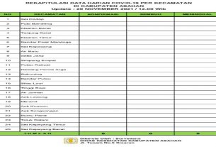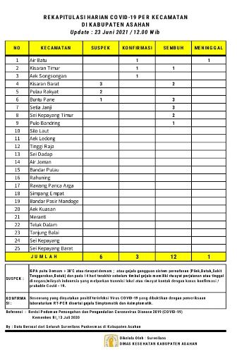 Lebih lanjut dikatakannya dimana data sebelumnya pada tanggal 22 Juni 2021 Rekapitulasi Harian Covid – 19 per Kecamatan di Asahan dengan jumlah 3 warga Asahan Suspek, 11 Konfirmasi, 18 Sembuh dan 1 Meninggal dunia akibat Covid.