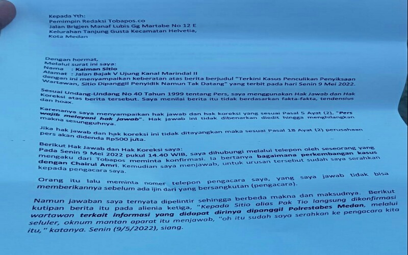 tobapos.co – Terkait berita di media ini dengan judul “Terkini Kasus Penculikan Penyiksaan Wartawan, Sitio Dipanggil Penyidik Namun Tak Datang” yang terbit pada hari Senin 9 Mei 2022, lalu.