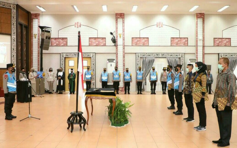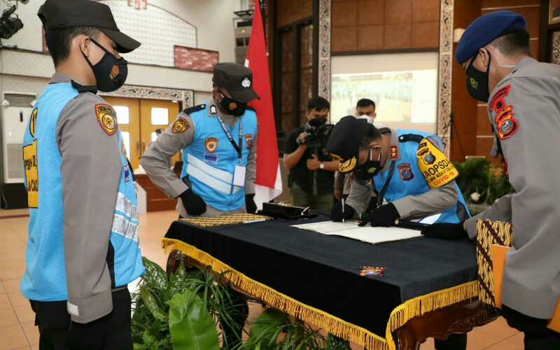 Kegiatan penandatanganan Fakta Integritas dan pengambilan sumpahl panitia, peserta dan orang tua pada seleksi penerimaan anggota Polri TA. 2021 tersebut tetap mengikuti aturan protokol kesehatan (Prokes)
