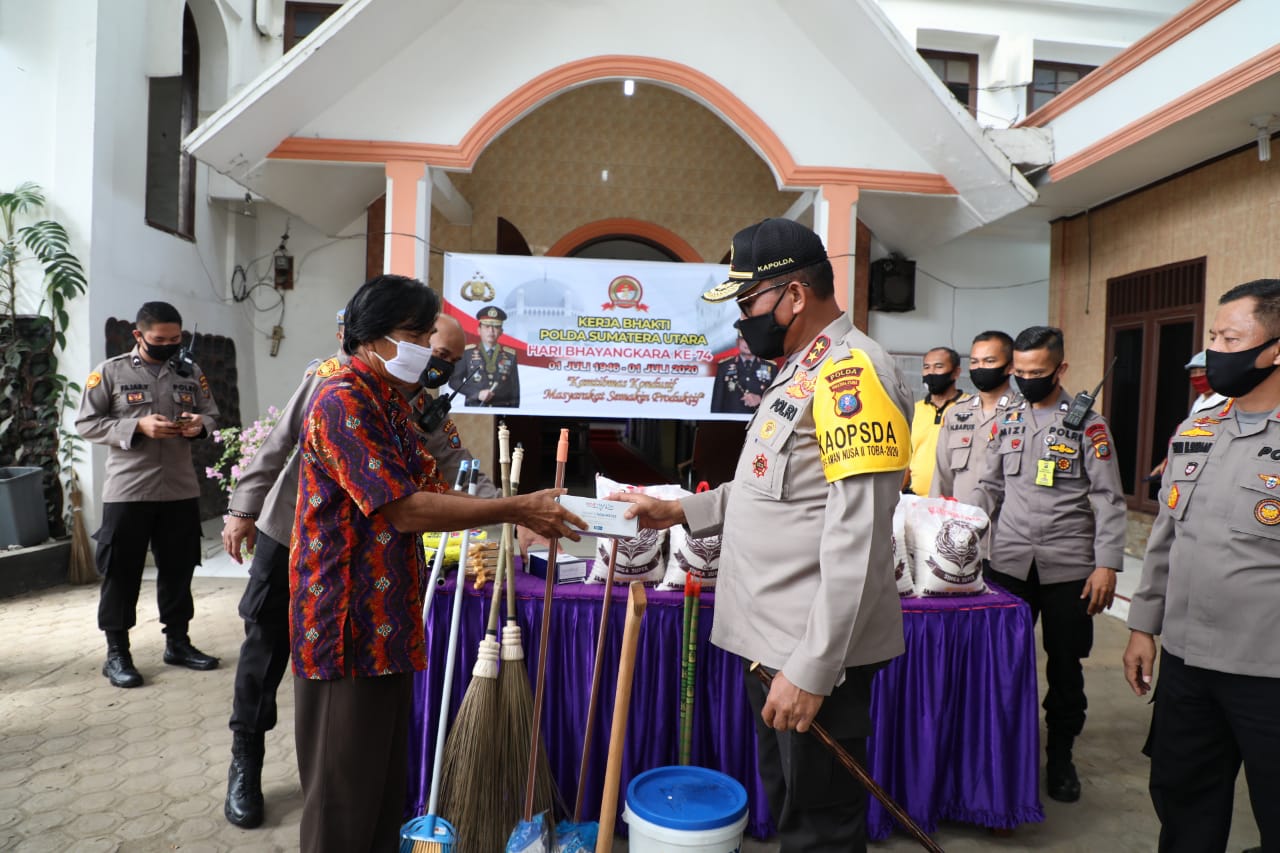 Kapolda Sumut turut memberikan langsung bantuan sosial secara simbolis kepada masing-masing pembina rumah ibadah.Sejumlah personil Polri juga turut di libatkan di rumah ibadah guna membantu pengurus gereja dan BKM Masjid membersihkan rumah ibadah.