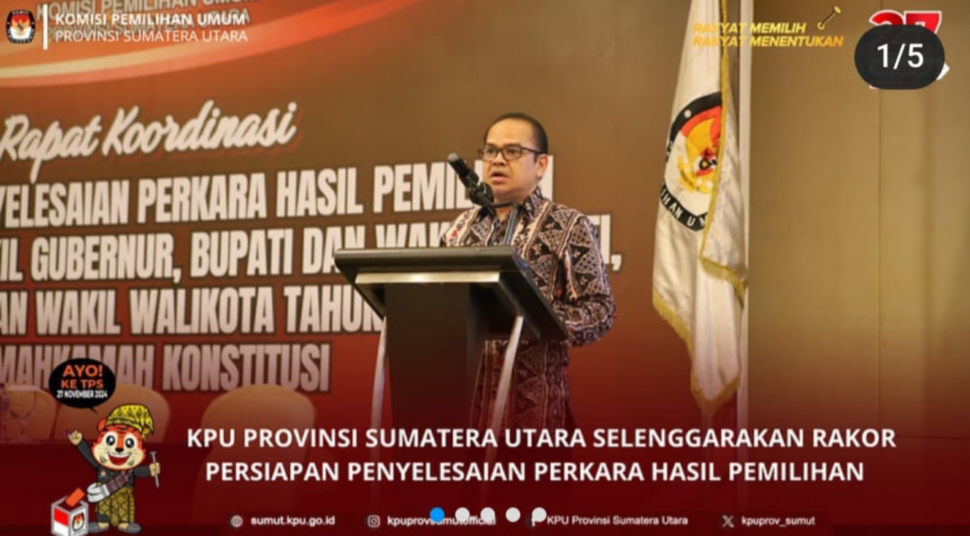 tobapos.co- KPU Provinsi Sumatera Utara menyelenggarakan rapat koordinasi (rakor) persiapan penyelesaian perkara hasil Pemilihan Gubernur dan Wakil Gubernur, Bupati dan Wakil Bupati, Walikota dan Wakil Walikota Tahun 2024 di Mahkamah Konstitusi yang diselenggarakan pada tanggal 19 – 20 Desember 2024 di Hotel JW Marriott Medan.