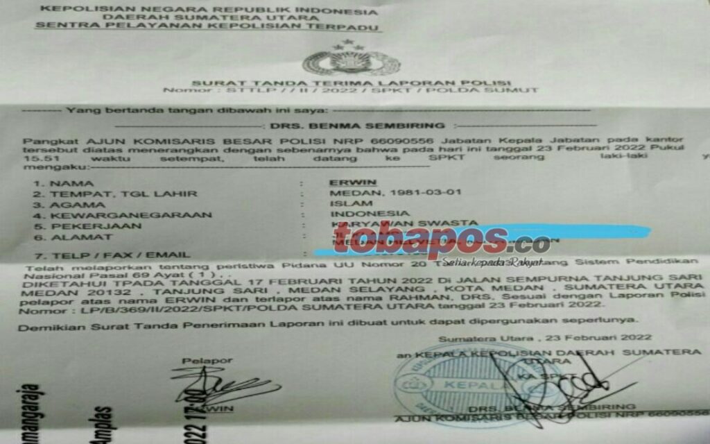 tobapos.co – Kasus dugaan penggunaan gelar palsu oknum Anggota DPRD Deli Serdang yang belakangan diketahui bernama Rahman ini mulai ramai menjadi perbincangan masyarakat sejak sekitar Februari 2022. Pasalnya saat itu telah resmi dilaporkan oleh pria bernama Erwin ke Polda Sumatera Utara dengan Nomor: LP/B/369/II/SPKT. Dalam melengkapi bukti laporannya, pelapor menyertakan foto spanduk Anggota DPRD Deli … Lanjutkan membaca Merunut Kasus Dugaan Gelar Palsu Rahman Anggota DPRD Deli Serdang, Setahun Lebih Masih di Polda Sumut
