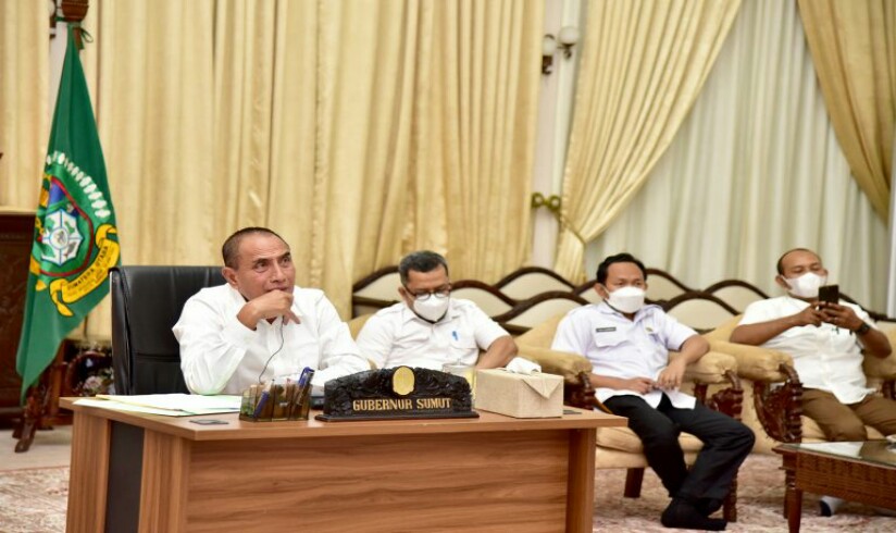 Edy Rahmayadi saat rapat koordinasi tentang pembangunan Pelabuhan Kuala Tanjung, secara virtual bersama Menteri Koordinator Kemaritiman dan Investasi (Marves) Luhut Binsar Pandjaitan dan Menteri Kabinet Indonesia Maju lainnya, Rabu (3/2/2021) malam.