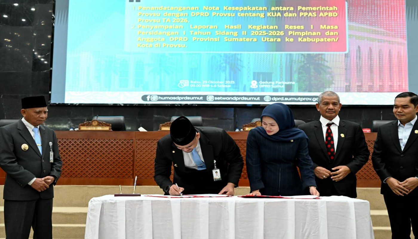 tobapos.co – Gubernur Sumatera Utara (Sumut) Muhammad Bobby Afif Nasution bersama Ketua DPRD Sumut Erni Ariyanti menandatangani Nota Kesepakatan antara Pemerintah Provinsi (Pemprov) Sumut dan DPRD Sumut tentang Kebijakan Umum Anggaran (KUA) dan Prioritas Plafon Anggaran Sementara (PPAS) APBD Tahun Anggaran 2026. Penandatanganan dilakukan dalam Rapat Paripurna, di Gedung DPRD Sumut, Jalan Imam Bonjol, Medan, Rabu 29 Oktober 2025.