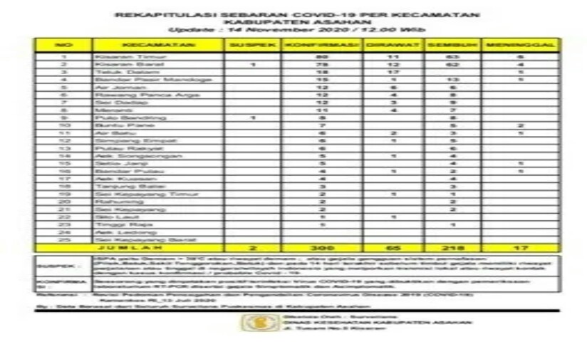 Dikatakannya, berdasarkan data terbaru hasil rekapitulasi sebaran Covid – 19 yang dikelola Dinas Kesehatan Kabupaten Asahan hari ini per tanggal 15 November 2020 memang tidak ada penambahan. Jumlahnya diketahui masih tinggi yaitu sebanyak 300 orang dengan rincian sebanyak 65 orang dalam perawatan, 218 orang dinyatakan telah sembuh, 17 orang meninggal dunia, serta terdapat 2 kasus suspek di Kecamatan Kisaran Barat dan Kecamatan Pulo Bandring.