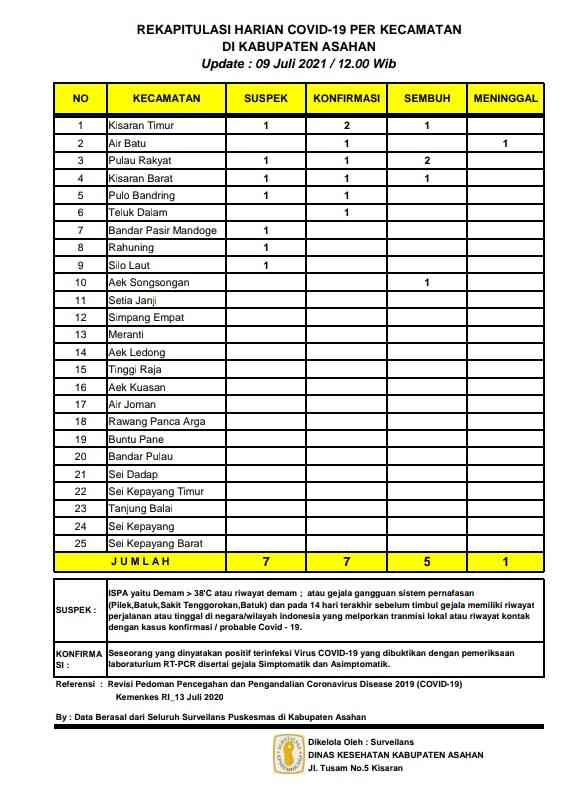 Tetap berdasarkan hasil Rekapitulasi Harian Covid-19 per Kecamatan untuk hari ini,sebagaimana data surveilans dari seluruh Puskesmas yang ada di wilayah Kabupaten Asahan yang di kelola Dinas Kesehatan Kabupaten Asahan.