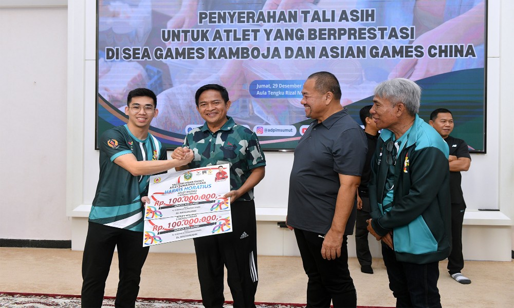Tali asih tersebut diserahkan langsung oleh Penjabat (Pj) Gubernur Sumut Hassanudin didampingi Kepala Dinas Kepemudaan dan Keolahragaan (Dispora) Sumut Baharuddin Siagian di Hall Rumah Dinas Gubernur Sumut, Jalan Jenderal Sudirman Nomor 41 Medan, Jumat (28/12).