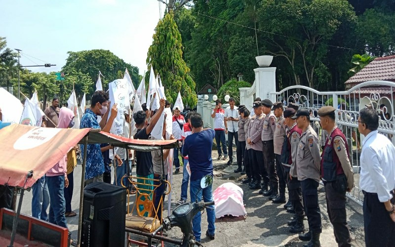 Massa yang datang dengan menggunakan beberapa becak, sepedamotor, membawa pengeras suaea, miniatur keranda mayat, spanduk dan poster.