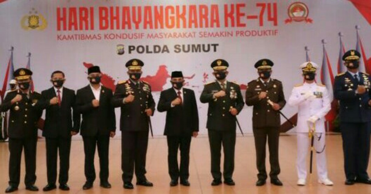 Di Polda Sumut upacara peringatan Hari Bhayangkara ke 74 yang dipimpin langsung Irjen Pol. Drs. Martuani Sormin, M.Si dihadiri Gubernur Sumatera Utara, Pangdam I/BB, Wakil Ketua DPRD Sumut, Kajati Sumut, Danlantamal I Belawan, Pangkosek Hanudnas III, Ka BNNP Sumut, Kabinda Prov Sumut, berikut para Pejabat Utama Polda (PJU) Sumut.