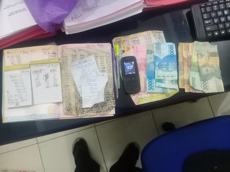“Barang bukti yang diamankan dari pelaku berupa Uang tunai Rp. 338.000 (tiga ratus tiga puluh delapan ribu rupiah), 2 (dua) buah blok notes, 2 (dua) buah pulpen, 1 (satu) buah buku berisikan angka angka, 1 (satu) unit hp nokia hitam,”ungkapnya.