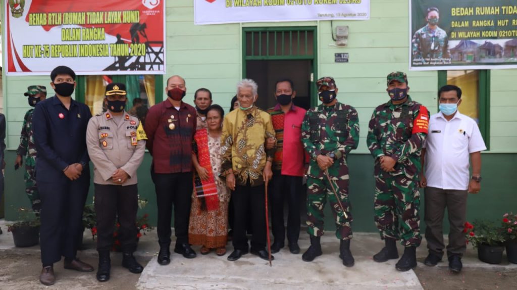 tobapos.co – Bupati Tapanuli Utara Drs. Nikson Nababan (foto- baju merah) dan Dandim 0210/TU Rony Agus Widodo bersama Forkopimda dampingi Danrem 023/KS Kolonel Inf Febriel Buyung Sikumbang dalam peresmian dan penyerahan kunci 1 unit rumah tidak layak huni yang telah dibedah menjadi layak huni milik Gulman Sihite di Desa Siraja Oloan Kecamatan Tarutung, Kamis, (13/08/2020).
